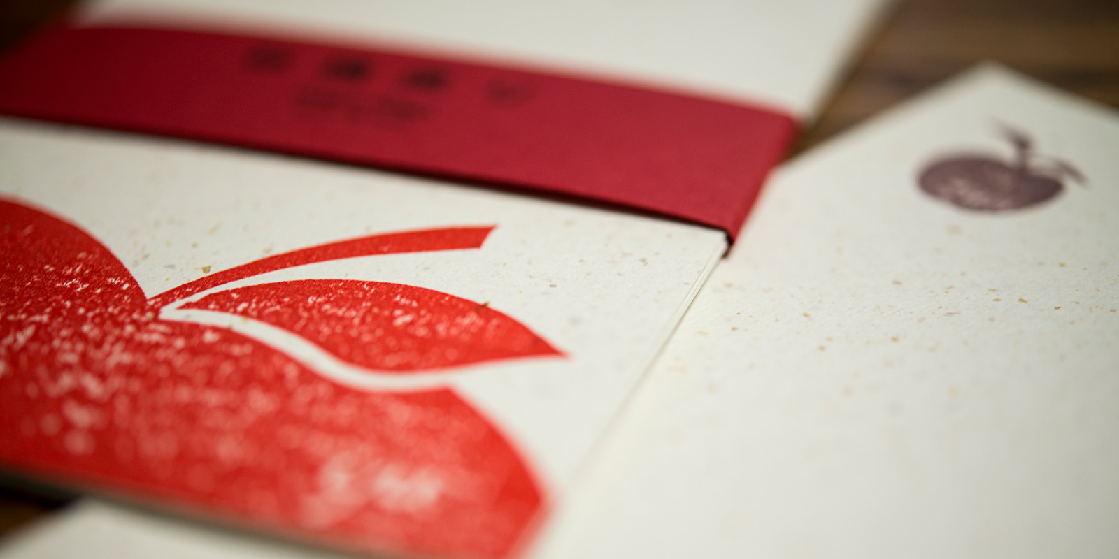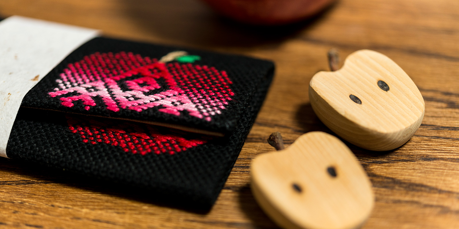 「津軽こぎん刺し」 こぎん刺しは、青森県津軽地方の農村女性の間で受け継がれた刺し子です。 生地を少しでも長く持たせ、冬の寒さから身を守るために、布の織り目を麻糸で塞ぐ刺し子が始まりました。 運針が細かいほど布は丈夫になり、保湿性は高まり、菱形模様が特徴のこぎん刺しへとなりました。 伝統を守りつつ、幅広い年齢層の皆様に使っていただきたい思いで「りんご」のモチーフを考案しました。